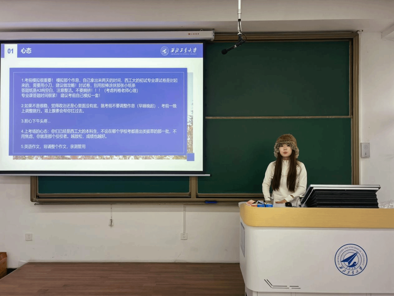 随后,2024级硕士研究生肖伟宁分享了与高嘉翼联合准备的备考建议。从各科目答题顺序到考场应对策略,这份“远程接力”而来的实用经验,不仅传递了学长学姐的深切关怀,也助力同学们更加自信、沉着地迎接考试。