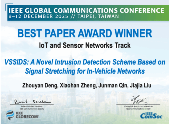 2023级博士邓舟彦、2024级硕士郑小涵、2022级博士秦郡蔓和刘家佳教授合作完成的论文《VSSIDS:一种基于信号伸缩的新型车内网络入侵检测方案》(VSSIDS: A Novel Intrusion Detection Scheme Based on Signal Stretching for In-Vehicle Networks)获大会“物联网和传感器网络”领域唯一最佳论文奖(Best Paper Award)。