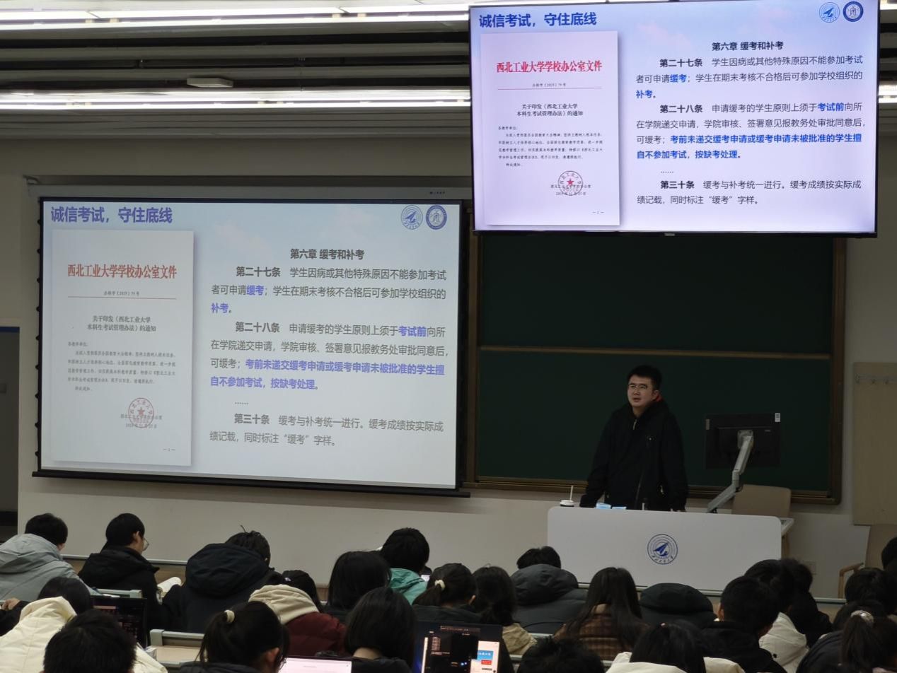 随后,付强带领全体同学集体学习《西北工业大学本科生考试管理办法》。他详细解读了办法中的各项条款,着重强调了考风考纪的严肃性。警示同学们要严格遵守考试规则,坚决杜绝任何作弊行为,以诚信的态度迎接期末考试,共同营造公平、公正、有序的考试环境。