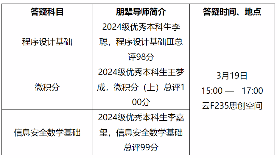 楼会议室分别举行大一、大二和大三年级线下答疑辅导活动。本次活动基于三个年级学生补考的实际情况,邀请朋辈导师,组织了针对微积分、计算机系统基础、密码学等多门课程的专门答疑,为大家提供精准助力。