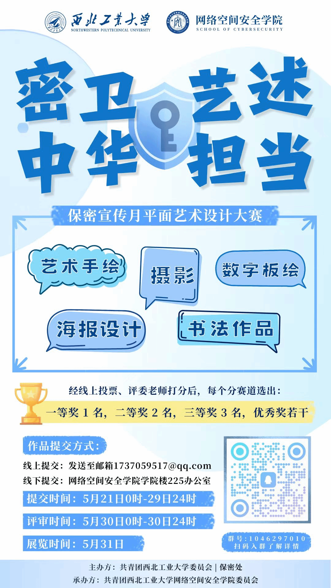摄影作品、海报设计作品、数字板绘作品、艺术手绘作品、书法作品五个赛道,每个分赛道选出:一等奖1名,二等奖2名,三等奖3名,以及优秀奖若干。