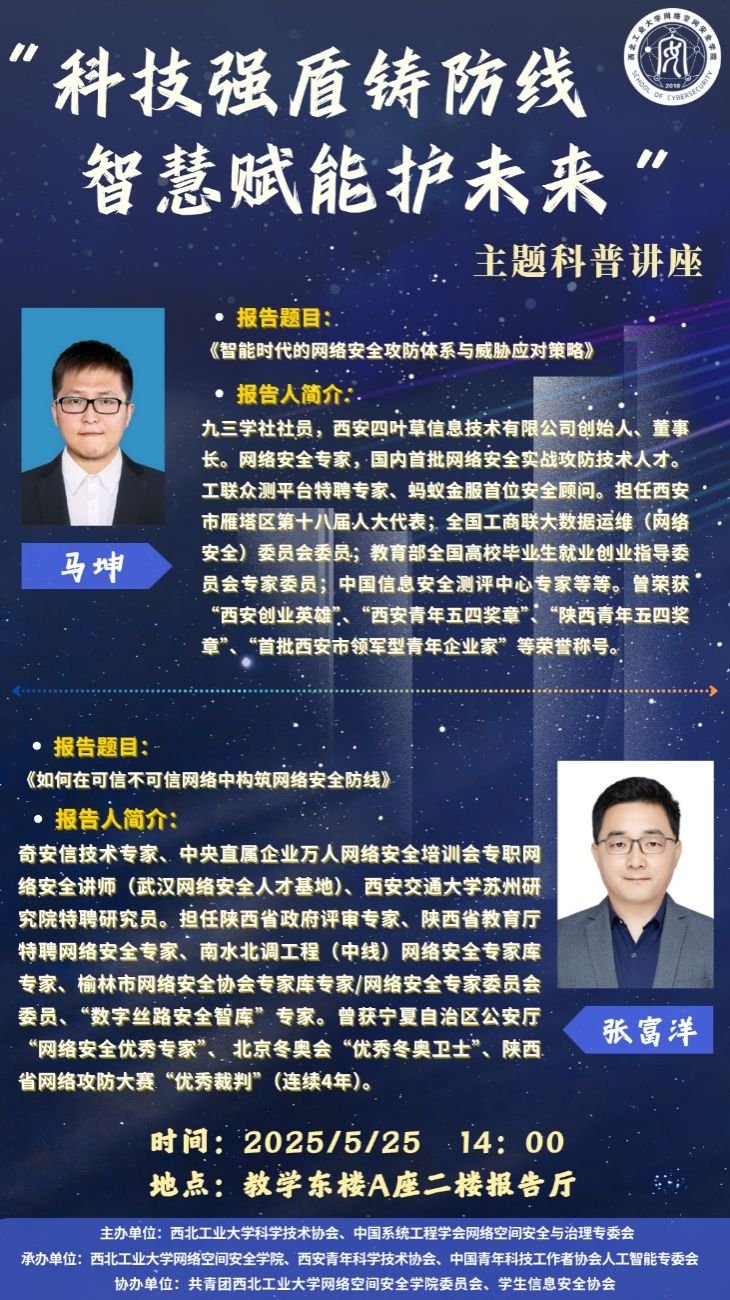 联合中国系统工程学会网络空间安全与治理专委会、西安青年科学技术协会、中国青年科技工作者协会人工智能专委会将于2025年5月25日14:00在西北工业大学长安校区教学东楼A座二楼报告厅开展“科技强盾铸防线,智慧赋能护未来”主题科普活动。该活动旨在通过科普讲座等形式,普及网络安全攻防体系,助力筑牢国家安全和社会稳定的科技防线,加快推进高水平科技自立自强和网安实战人才自主培养。