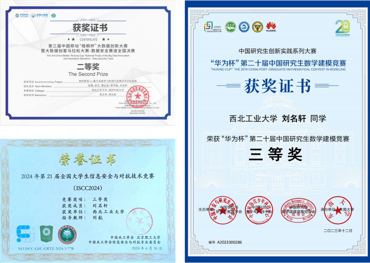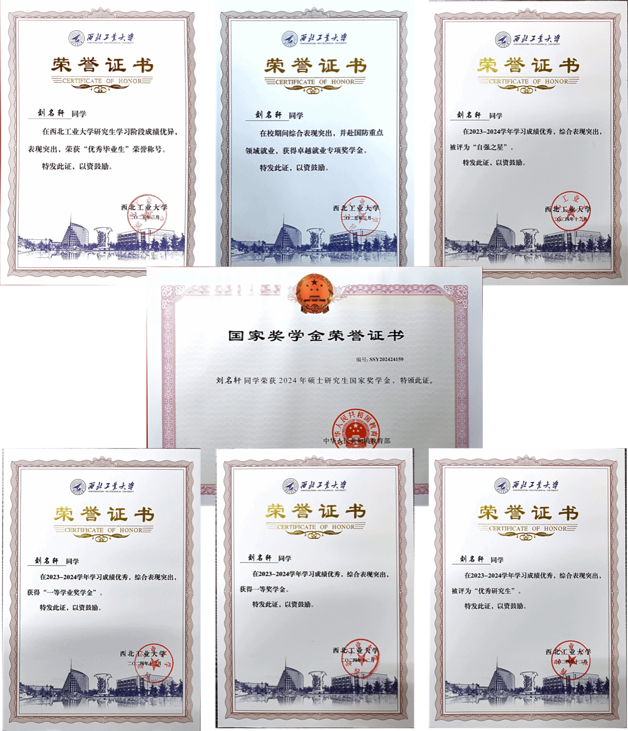 刘名轩连续两年获得“优秀研究生”荣誉称号,并获得“自强之星”、“优秀毕业生”荣誉称号。荣获2024年研究生国家奖学金,西北工业大学一等学业奖学金以及卓越就业专项奖学金等。